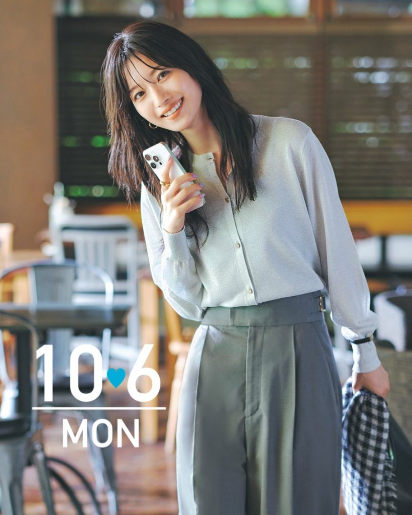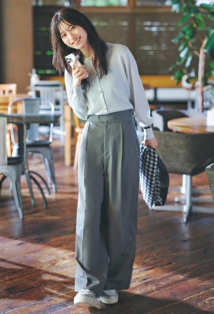 轻盈的薄荷灰针织衫自带清新感,与高腰阔腿裤组合,显高显瘦又极具松弛气质。