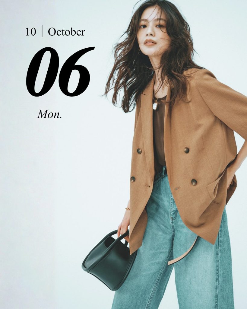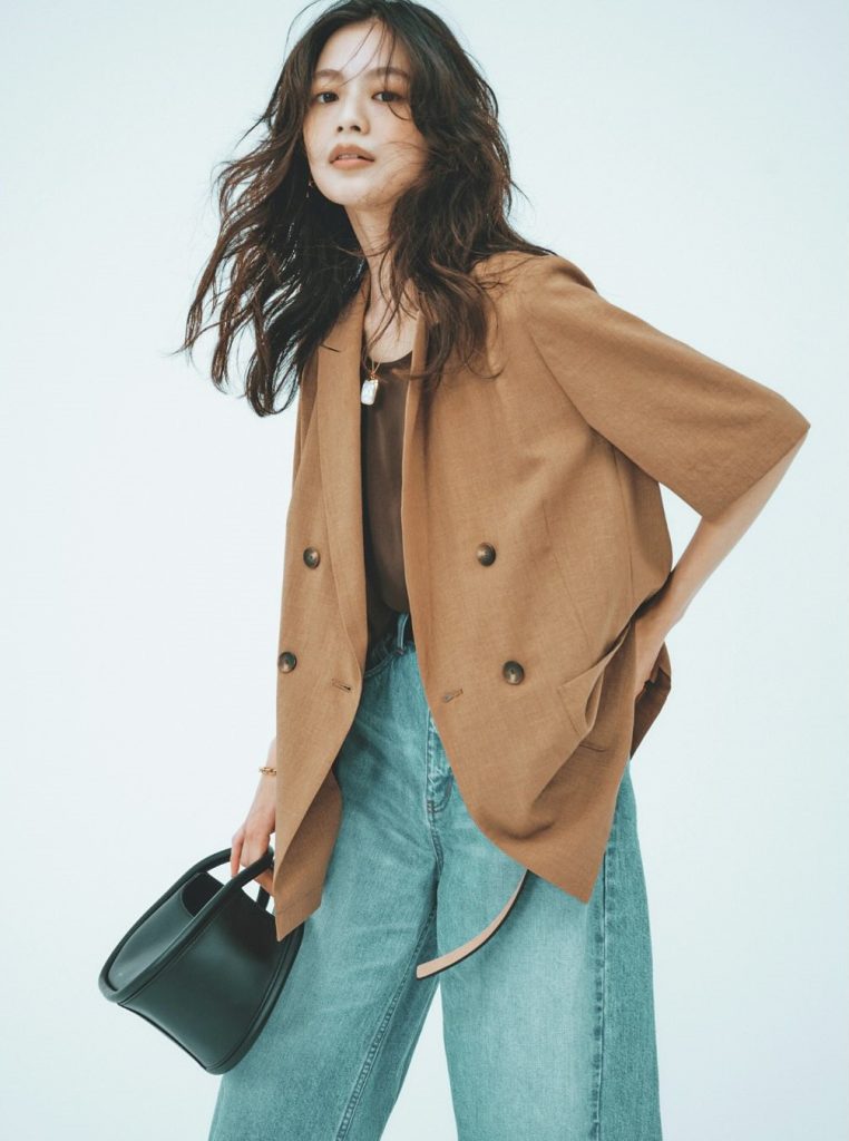 夏季活跃的短袖西装依旧是换季利器。焦糖棕色调呼应秋意,叠穿深棕吊带与复古蓝牛仔裤,展现随性与质感的平衡。