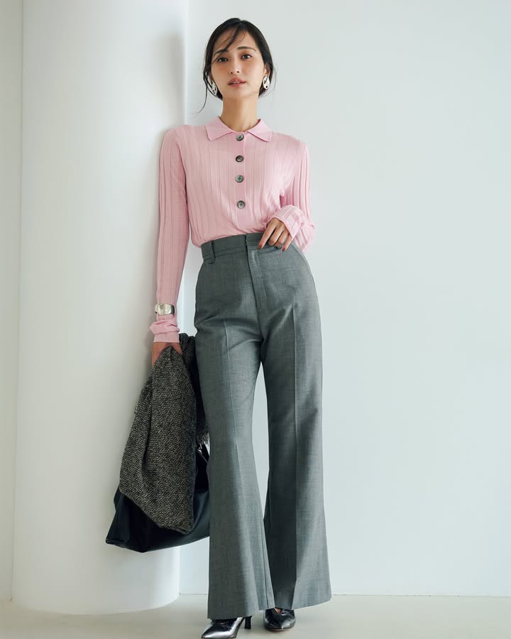 挺括的灰色西裤勾勒修长线条,搭配温柔粉色针织上衣,营造出知性又不失甜度的气质。